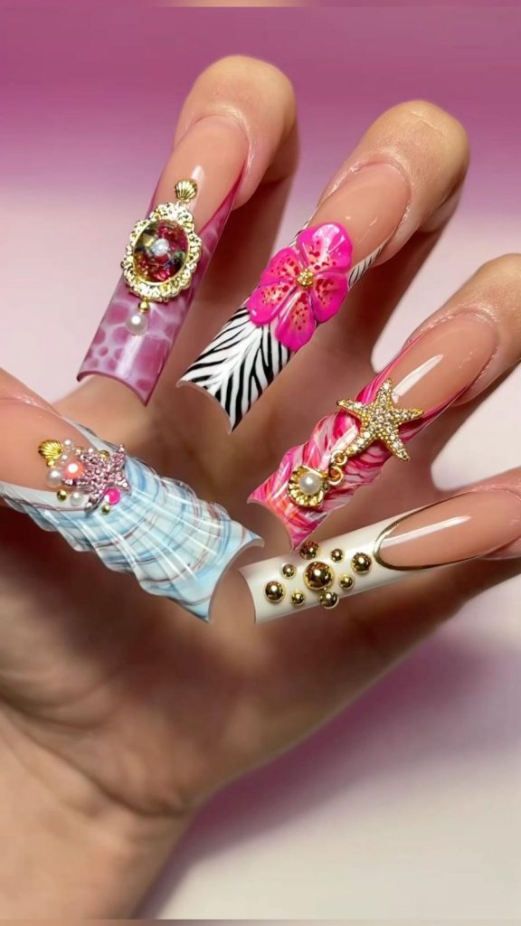 Charms auf den Nägeln sind kleine Schmuckstücke, die auf die Nageloberfläche gesetzt werden, um das Design zu veredeln. Sie können aus Strass, Metall oder Perlen bestehen und verleihen den Nägeln einen glamourösen und personalisierten Look.